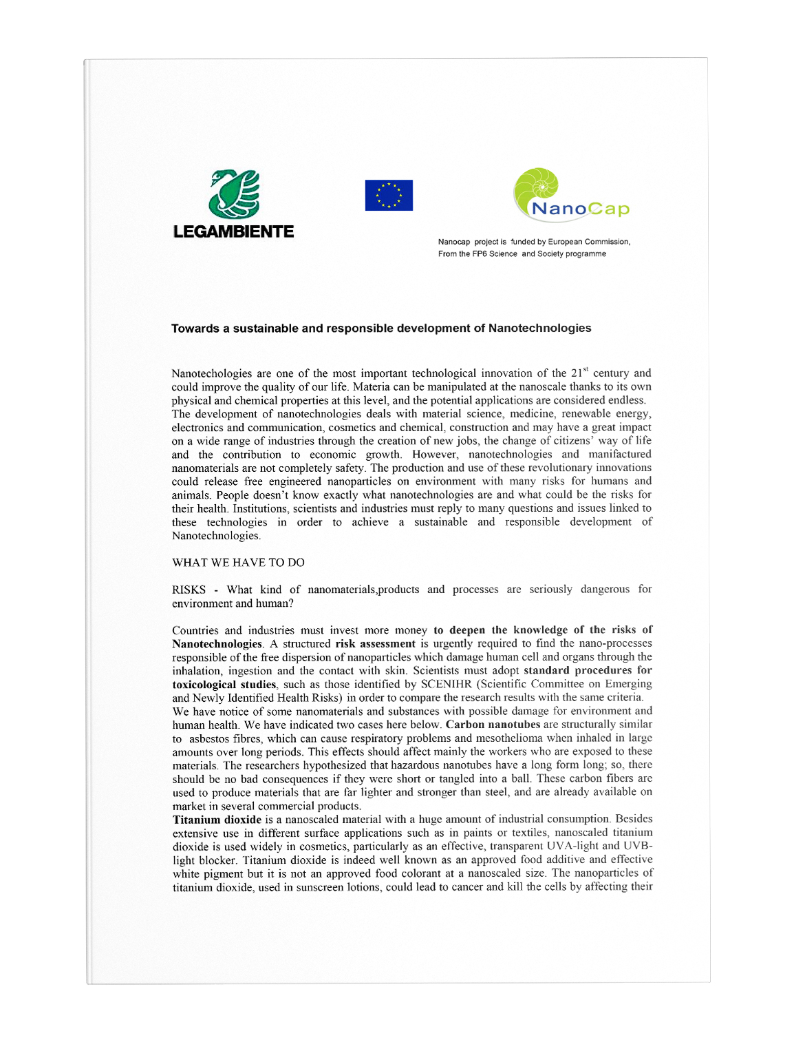 Nanotechologies are one of the most important technological innovation of the 21st century and could improve the quality of our life. Materia can be manipulated at the nanoscale thanks to its own physical and chemical properties at this level, and the potential applications are considered endless. The development of nanotechnologies deals with material science, medicine, renewable energy, electronics and communication, cosmetics and chemical, construction and may have a great impact on a wide range of industries through the creation of new jobs, the change of citizens’ way of life and the contribution to economic growth. However, nanotechnologies and manufactured nanomaterials are not completely safe. The production and use of these revolutionary innovations could release free engineered nanoparticles on environment with many risks for humans and animals. People don’t know exactly what nanotechnologies are and what could be the risks for their health. Institutions, scientists and industries must reply to many questions and issues linked to these technologies in order to achieve a sustainable and responsible development of Nanotechnologies.