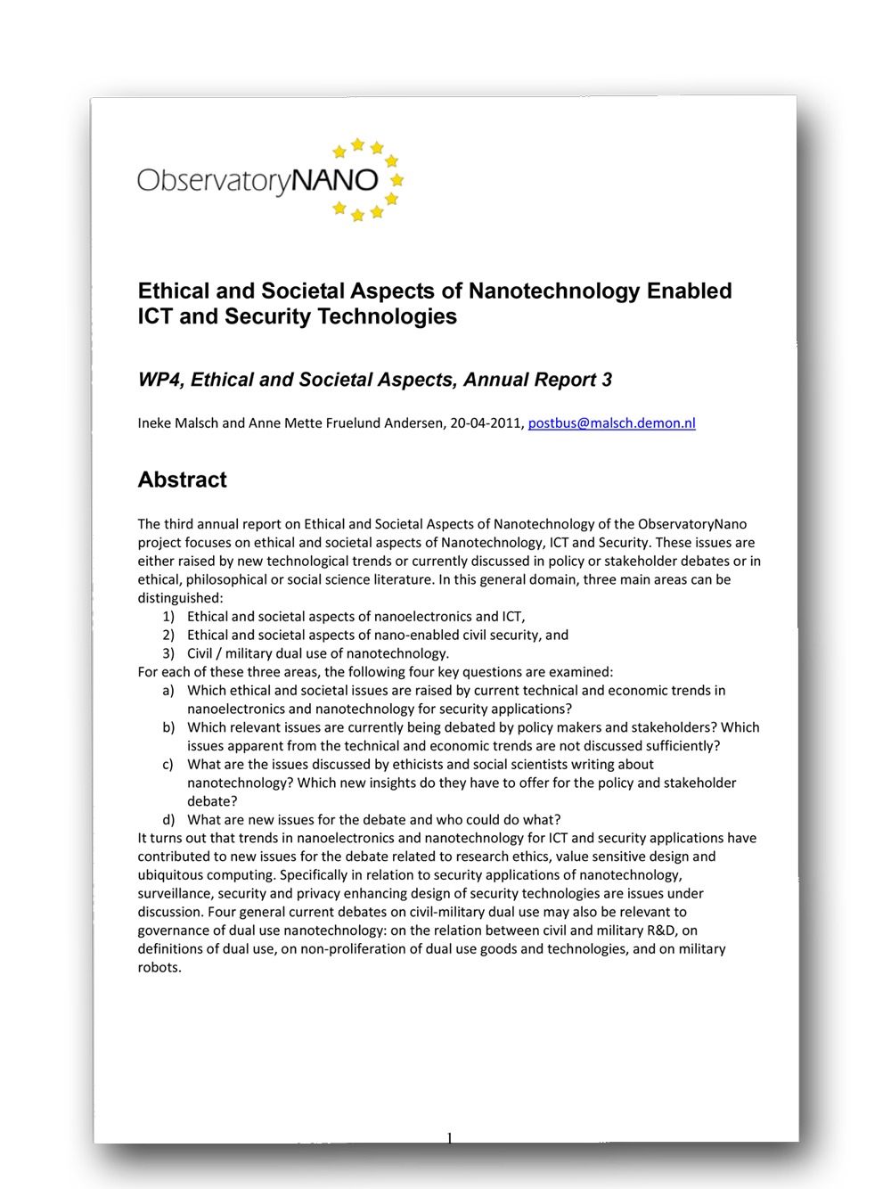 In this report, public debates and literature on ethical and societal aspects of nanotechnology in ICT and security, and civil‐military dual use aspects of nanotechnology are discussed. The main aim is to identify new or persistent issues in these debates that merit the attention of policy makers responsible for nanotechnology in Europe. Another aim is to raise awareness of these issues among the partners in the ObservatoryNano project responsible for reports on technical and economic trends in two of the ten technology sectors covered by the ObservatoryNano: ICT and security.